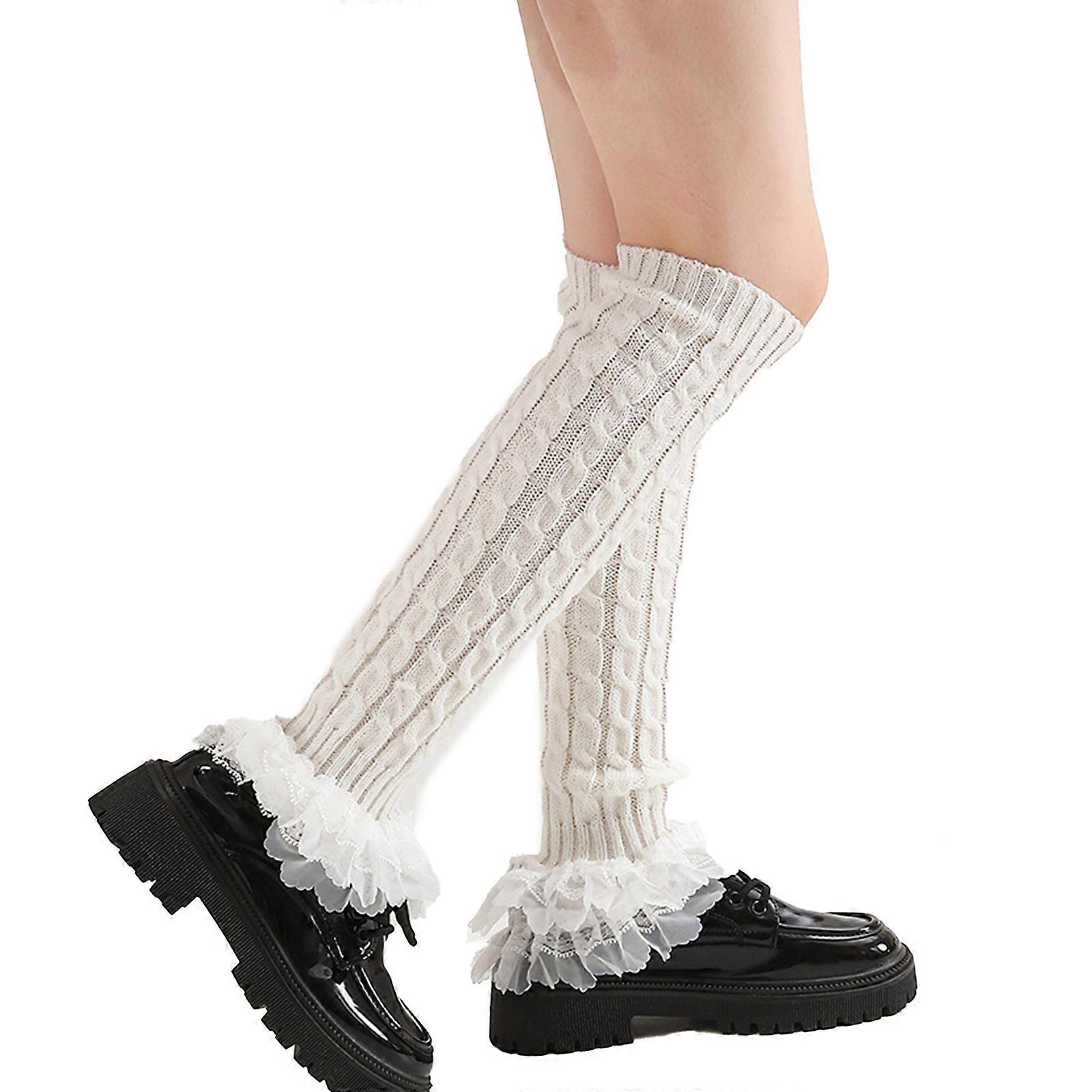 Fairycore Cable Knit Leg Warmer Knee Length Socks Japanese Elegant Tiered Ruffled Lace Leg Sleeve Boot Covers for Women White