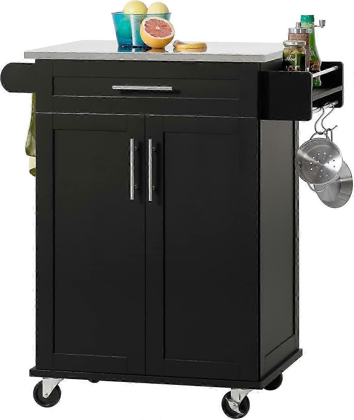 FKW110-SCH,Kitchen Cart with Stainless Steel Worktop Kitchen Trolley on Wheels Storage Unit Cabinets Cupboard with Doors and Drawer&Side Rack