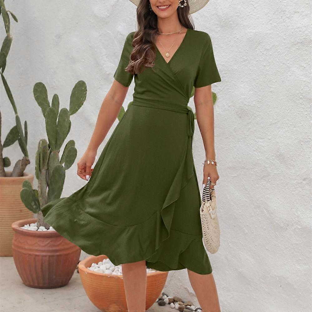 GMXIA New Product V -neck High -waisted Strap Dress Solid Color Long Short -sleeved Dress Vacation Travel Skirt