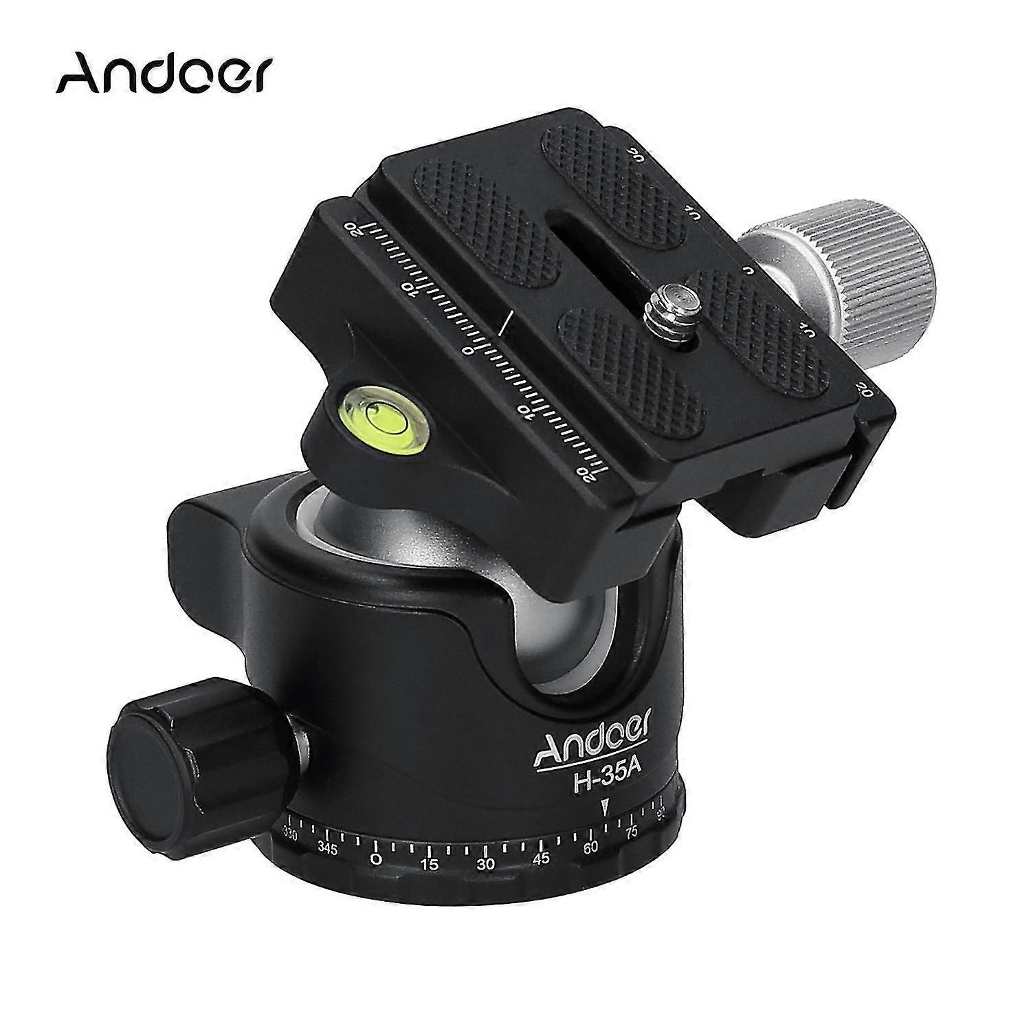 Features: Metal Tripod Ballhead: Durable aluminum alloy material, adopts CNC processing and surface anodizing treatment, exquisite workmanship and smooth operation. Lower Gravity Center, More Stable Use: Special side locking system design, which makes its gravity center 15% lower than traditional ball head and have better stability. Flexible and Smooth Operation: The U-groove enables you to switch vertical and horizontal shooting quickly; and panoramic structure design for easier 360amazing panoramic shooting. Standard Quick Release Plate: The quick release plate designed with standard 1/4 inch screw and 4pcs anti-slip rubber pads, can install DSLR camera, DV, camcorder easily and stably. Wide Compatibility: Can be easily mounted onto tripod, monopod and other devices with 1/4 inch or 3/8 inch screw; and the built-in bubble level can help you find the balance quickly. Specifications: Brand: Andoer Model: H-35A Material: Aluminum alloy Max. Load Capacity: Max. 15kg/33lbs Screw Mount for Camera: 1/4 inch Screw Hole: 1/4 inch and 3/8 inch Ball Sphere Diameter: 35mm Base Diameter: 50mm Item Weight: 307g/ 10.8oz Package Size: 10 * 9 * 7cm/ 3.9 * 3.5 * 2.8in Package Weight: 340g/ 12oz Package List: 1 * BallHead