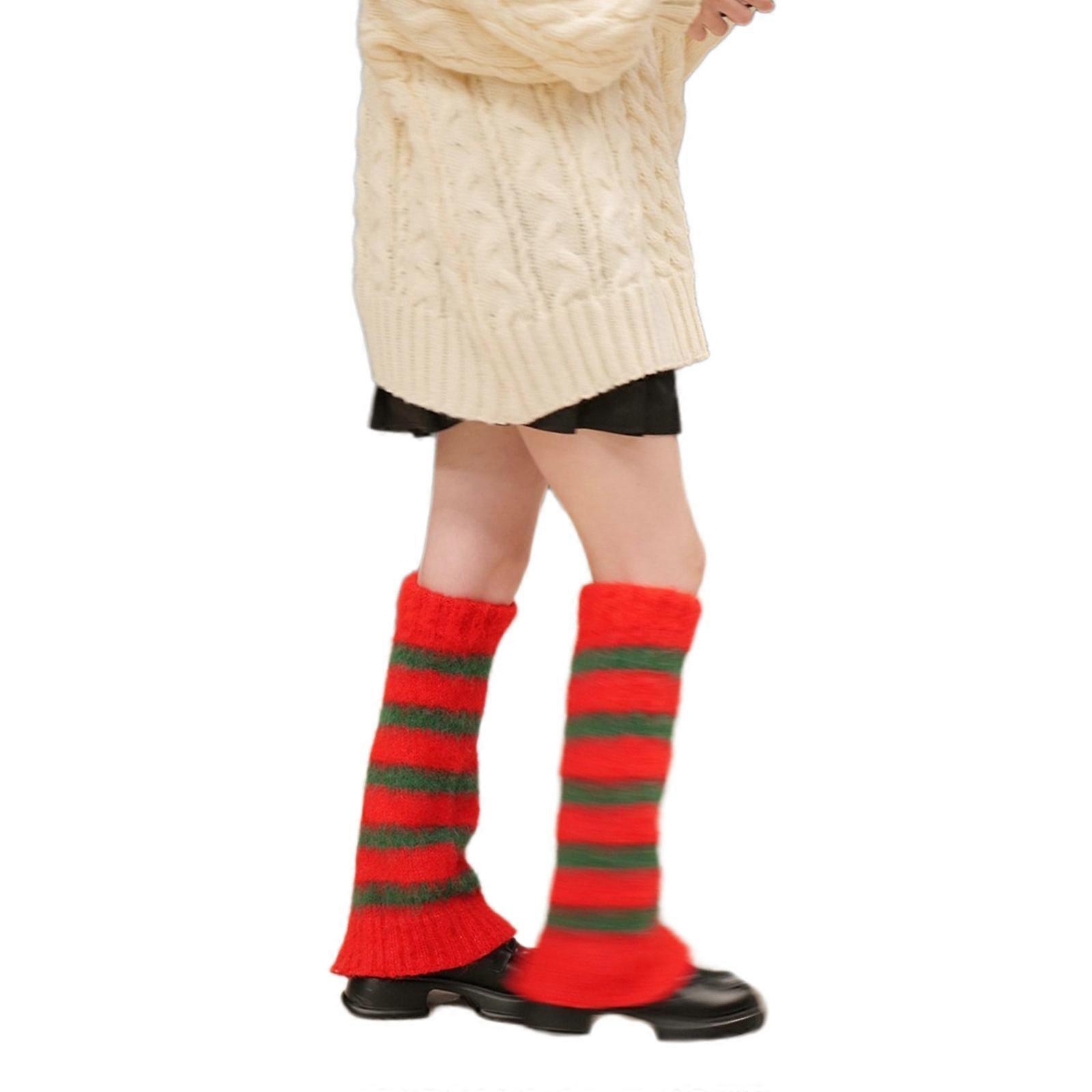 Harajuku Leg Warmer Winter Warm Colorblock Striped Furry Boots Cover Flared Hem Loose High Tube Calf Socks for Women red and green stripe