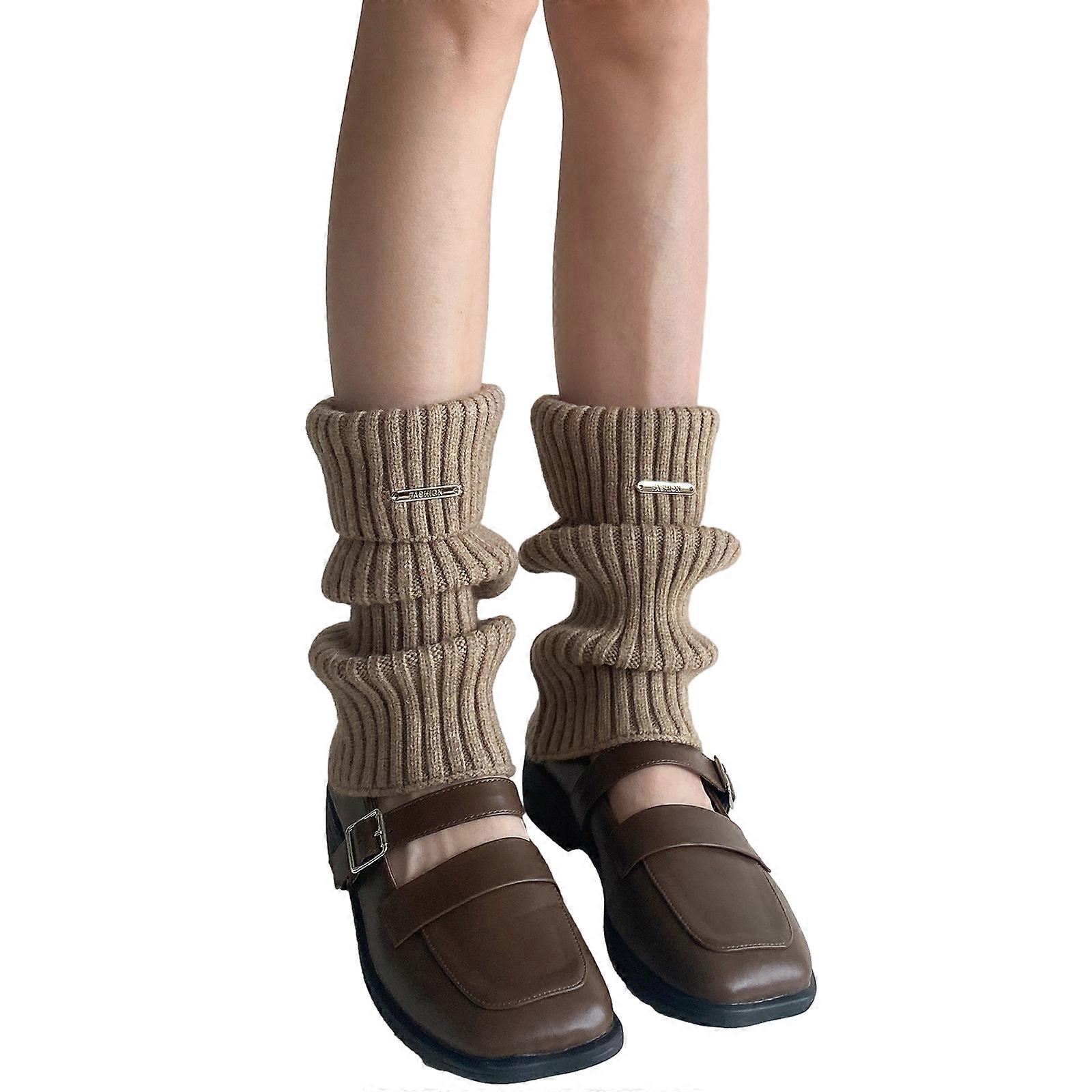 Harajuku Y2K Women Ribbed Knit Slouchy Leg Warmer Long Socks Metal Label Turn Cuff Loose Leg Cover Boot Socks Stockings Khaki