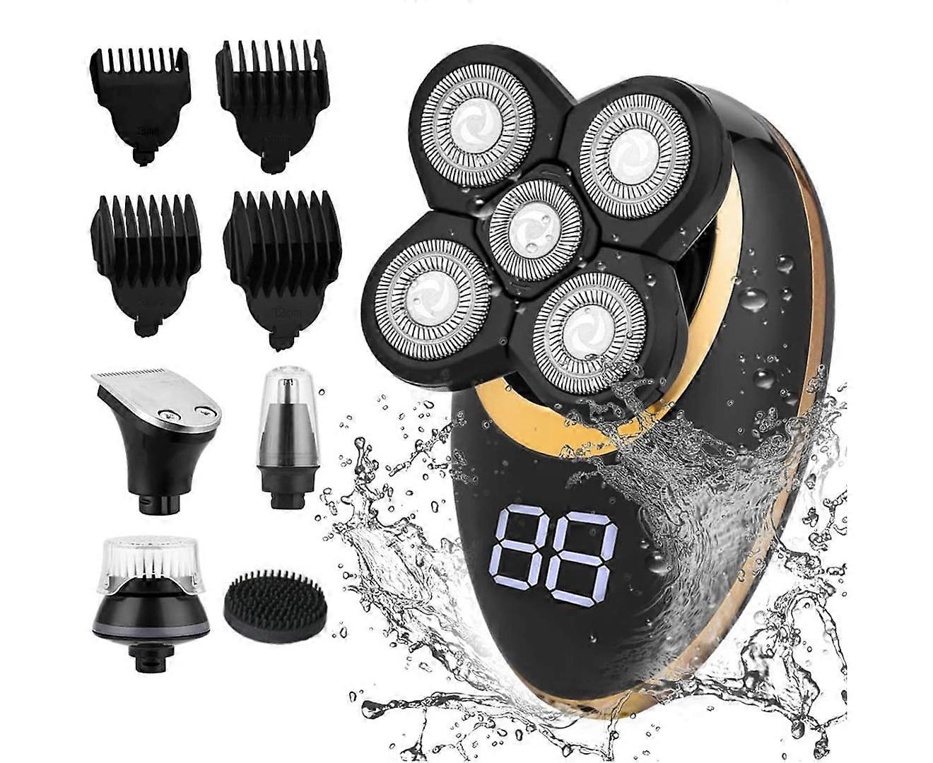Product Description Material: ABS Color: gold, black Waterproof: IPX7 Package Contents: 1 * Shaver 1 *Silicone face brush 1 *Hair clipper head 1 * nose and ear trimmer 1 *Cleaning brush 1 * USB cable 4 *comb 1.[Multifunctional razor]: electric shaver with 4 removable attachments, including an electric shaver with 3-6-9-12 mm guide combs as well as a precision hair trimmer, a nose hair trimmer and a facial cleansing brush. 2.[LED display]: Razor is very compact and lightweight, making it a perfect travel companion. The electric shaver is a must for the bald skin wearer. LED display gives you a good overview of the battery life, which can be easily recharged via USB. 3.[Easy to clean and beautiful design]: Fully washable, IPX7 allows a thorough dry or gentle wet shave with gel or foam, even under the shower. The device is ergonomically designed so that it sits comfortably in the hand. Razor for head/smooth and face, men's electric shaver. 4.[User-friendly design]: One-button control ensures immediate use. Replaceable head makes multi-functional use; the water-resistant cutter ensures easy cleaning. 5.[Perfect gift]: The electric shaver with beautiful, modern look and elegant design is an ideal gift for father, husband, boyfriend and son. Men's electric 4D razor, electric shaver, LED display, precision trimmer, beard trimmer, wet and dry razor, IPX7 waterproof.