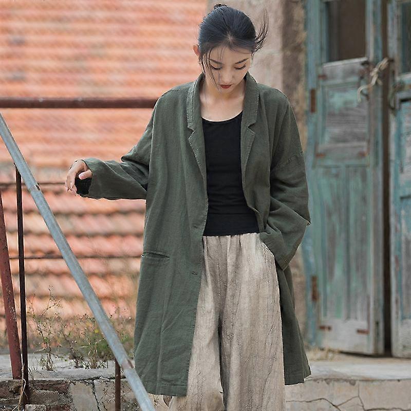 Johnature Women Vintage Ramie Cotton Tailored Coat Solid Color Long Sleeve Pockets Clothes Autumn Loose Coats