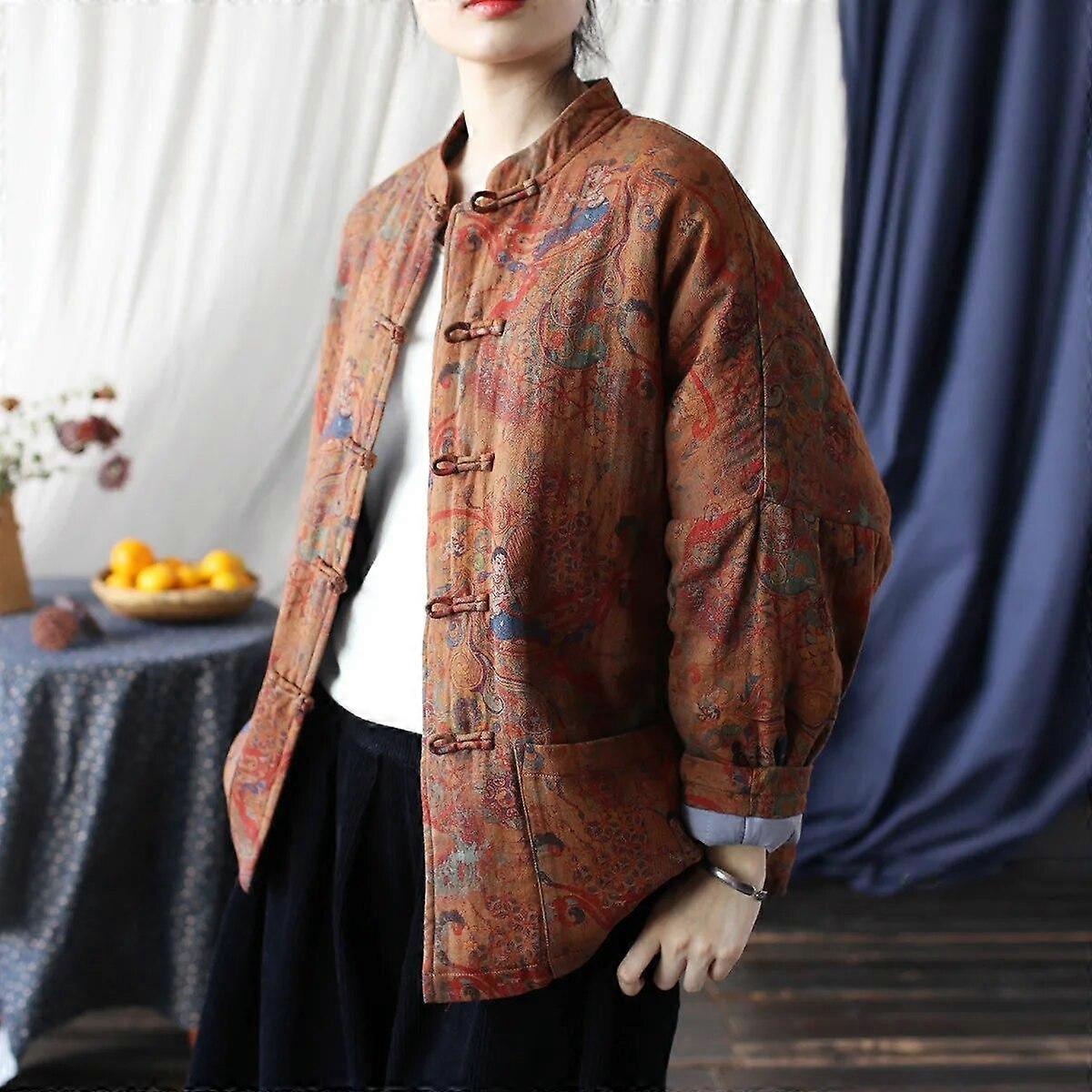 Johnature Women Vintage Print Floral Warm Parkas Stand Long Sleeve Winter Coats Button Patchwork Pockets Women Parkas