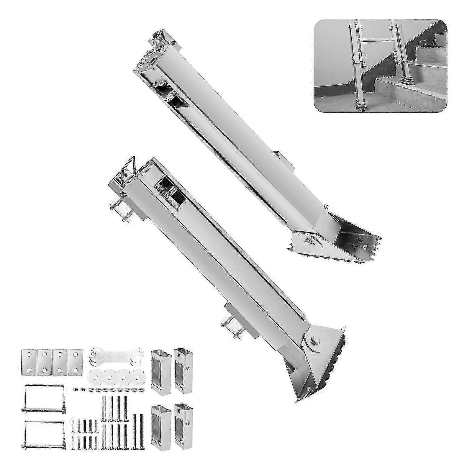 *KeyFeatures<br> *Adjustable Range: Up to 11.4 inches with a total length of 17.9 inches. Ideal for stairs, uneven terrain, and curbs. Provides stable support on any surface for a secure and reliable experience.<br> *Effortless Leveling: Features an easy-to-adjust locking plate for secure fixation. Anti-slip rubber feet ensure additional stability and a perfect fit on various surfaces, enhancing safety and efficiency.<br> *Fast Setup: Install quickly with just marking, drilling, and fixingno complicated steps required. Ensures a balanced ladder and improves work efficiency with ease.<br> *Versatile Fit: Suitable for fiberglass, aluminum, telescopic, and straight ladders. Ensures safety and efficiency across different ladder types and applications.<br> *High-Strength Construction: Made from high-strength carbon steel for maximum stability and durability. Reliable locking plate and durable, anti-corrosion rubber feet enhance the leveler's lifespan. Choose our leveler for dependable and worry-free use every time.<br> *******************************************************************************************************<br> *Specifications<br> Item Model Number: KZ-17.9<br> Product Dimensions: 7.8 x 2.95 x 17.7 inches / 185 x 75 x 450 mm<br> Adjustable Length: 11.4 inches / 288 mm<br> Main Material: Carbon Steel<br> Color: Silver<br> Net Weight: 10.8 lbs / 4.9 kg<br> *******************************************************************************************************<br> *Pakcage Content<br> 2 x Main Units<br> 2 x Support Feet<br> 2 x Long Fixing Tubes<br> 2 x Short Fixing Tubes<br> 2 x D-Shaped Pins<br> 2 x Galvanized Hex Bolts M8 x 70<br> 2 x M8 Lock Nuts<br> 10 x Galvanized Hex Bolts M6 x 25<br> 8 x Galvanized Hex Bolts M6 x 50<br> 8 x M6 Lock Nuts<br> 4 x Square Washers<br> 4 x Round Washers<br> 2 x Open-End Wrenches 10-14<br> 1 x User Manual