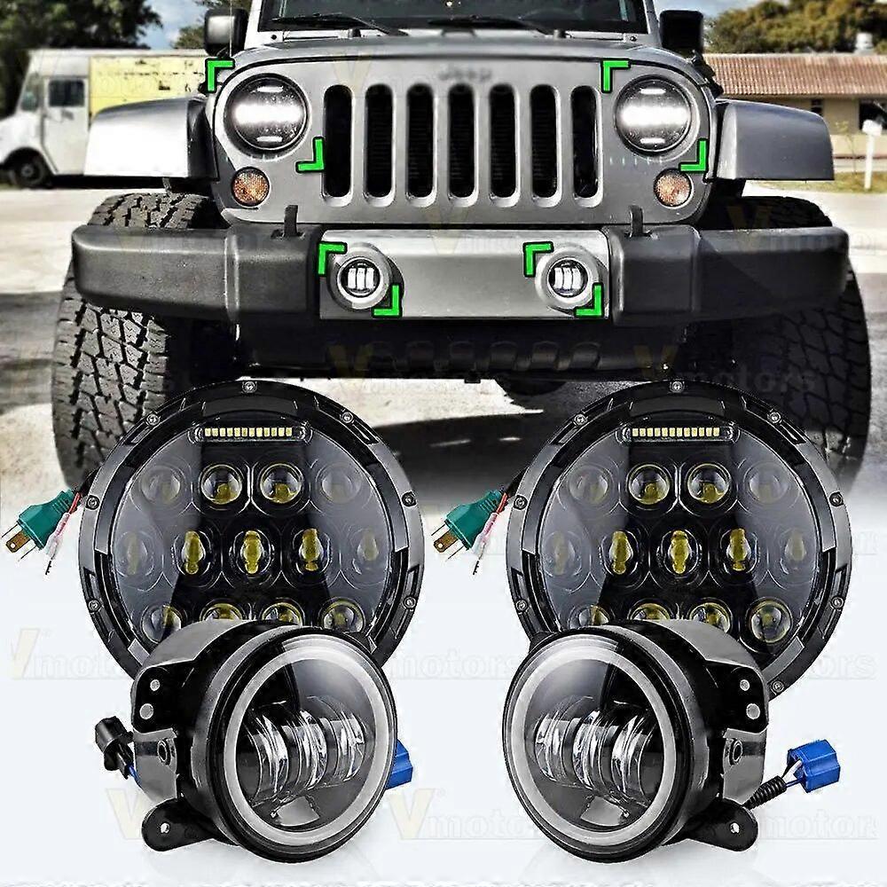 LED 7 Inch 75W Headlights White DRL + 4" LED Fog Light DRL Combo Kit For Jeep Wrangler JK 2007-2017