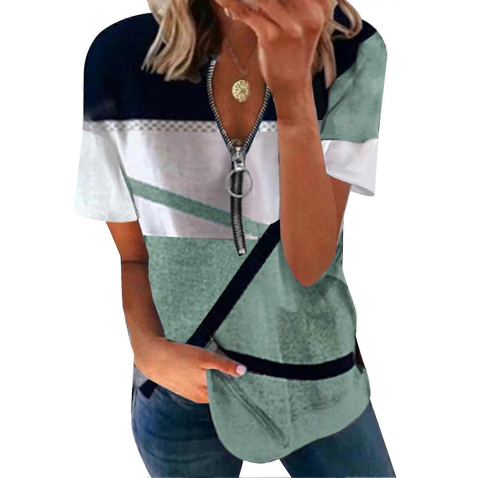 Women Short Sleeve Pullover Tops Summer Fashionable Casual Loose Contrast Color Print Zipper Women Short Sleeve Blouse Blue S