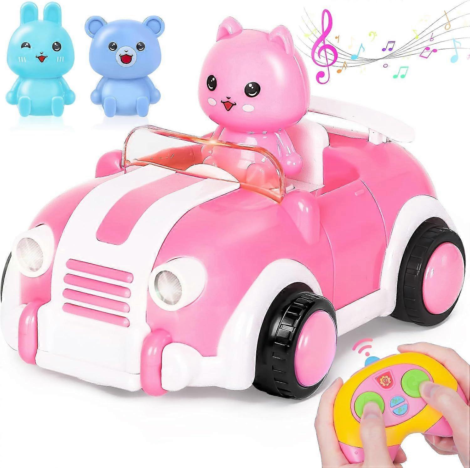 First Remote Control Car: Our remote control car for toddler comes with engaging music and sound features, 3 detachable animal cartoon figures, and two remote controls with forward and reverse motions. With the LED flashing headlight, it brings more fun to girls age 2 3 4 5 during playtime. Kids Control Friendly : Design with 2 big buttons to control forward, backward or turn and paper instructions, easy to control and suitable for little hands. Kids can master and improve hand-eye coordination, fine motor skills in the game with our remote control car. Safe&High Quality: Non-toxic ABS plastic construction, a remote control without antenna and rounded edges for safety and injury prevention. While most others come with a thin metal antenna which breaks easily and poses a safety hazard. Power Saving: Toy Car require 3 AA batteries and RC require 2 AA batteries. If your kid forgets to turn it off, the car will voice prompt and automatically auto-off after 5 minutes without operation. Help you save power and for long-time use. Great Gift for Kids :The remote control car not only helps kids to explore the field of automotive technology, but also develop kid's intelligence and practicing ability; interactive toys for people game. Easy to use, a perfect gift for birthday, Christmas, new year, or other holiday/party.