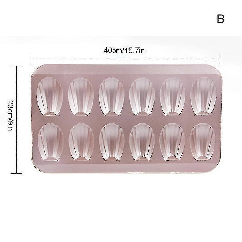 A. Features: - It is a classic French-style flat-bottomed biscuit baking tray in a shell shape, capable of holding 12 or 6 biscuit cakes simultaneously. It is quite suitable for making personalized desserts. The novel shape enables you to make use of your favorite ingredients. B. Carbon steel with non-stick coating: The durable carbon steel is combined with a non-stick coating, allowing food to slide off relatively easily. You can use a silicone brush freely, and cleaning is relatively effortless. C. Safe baking: It is heat-resistant, safe, odorless, with relatively strong stability and uniform heat conduction. It is suitable for high-temperature baking and performs stably. It adopts an all-round curled edge design with smooth edges, which is unlikely to hurt your hands. D. Multi-functional cake baking tray: This baking tray is not only suitable for baking cakes but also for cooking muffins, cheesecakes, mini quiches and other foods. It can also be used to make ice cubes in summer. Undoubtedly, this muffin baking tray is useful for baking enthusiasts. E. Easy to use: The unique design of the muffin tray is suitable for most ovens. Just pour the well-mixed batter into the round cups and you can enjoy the practical functions of the muffin tray. Notes: 1. Due to differences in monitors and lighting effects, the actual color may vary slightly from the picture. 2. Due to manual measurement, a deviation of 1 - 3 cm is allowed. Material: Carbon steel + non-stick coating Specification: 12 or 6 grooves Dimensions: For 6 grooves: 26.5×18.5×1.6 cm, shell holes: 7.5×4.5 cm; for 12 grooves: 40×22.8×1.6 cm, shell holes: 7.5×5 cm Weight: For 6 grooves: 198 grams each; for 12 grooves: 300 grams each Items included: 1 shell cake baking tray