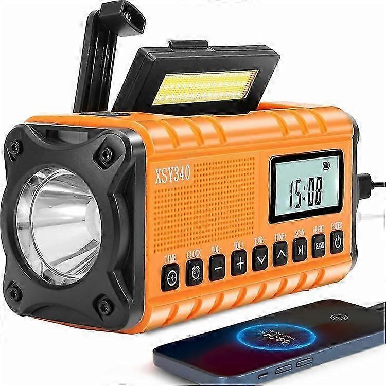 Digital Display Multi-Purpose Emergency Solar Radio This portable emergency radio is equipped with a digital display and multiple functions, making it an essential tool for outdoor adventures, camping, and disaster preparedness AM/FM/NOAA Digital Tuning Radio Tune into AM, FM, and NOAA weather bands with easy digital tuning, automatic station search, and storage, keeping you informed with the latest weather updates and emergency broadcasts Clock and Alarm Function Stay on schedule even in remote locations with the built-in clock and alarm, perfect for tracking time during outdoor activities or emergencies 10000mAh Power Bank With a 10000mAh power bank, this device can charge your phone or other essential devices, ensuring you stay connected when it matters most Multiple Charging Options The radio supports hand-crank power, solar charging, and USB charging, giving you versatile options to keep it powered up in any situation, whether it’s sunny or overcast SOS Alarm for Emergencies In case of emergency, the built-in SOS alarm can be activated to alert rescuers or signal for help, making it an essential safety feature for outdoor adventures and preparedness Powerful Illumination Features a dual-mode flashlight (near/far beam) and a reading lamp, providing essential lighting in various situations Specifications: Frequency Range: AM: 520-1710kHz, FM: 87-108MHz, WB: 162.400-162.550MHz Charging Methods: USB, Hand Crank, Solar Panel Lighting: Flashlight (Near/Far Beam), Reading Light Alarm Volume: >120dB with SOS flashing light Battery Capacity: 10000mAh Power Output: 2W Operating Temperature: -10 to 60℃ Water Resistance: IPX3 Dimensions: 18 x 7 x 10cm Functions: flashlight (low beam/high beam), reading light, power bank, radio, siren, alarm clock, headphone jack Runtime: Flashlight ~60 hours, Reading Light ~60 hours, Radio ~70 hours