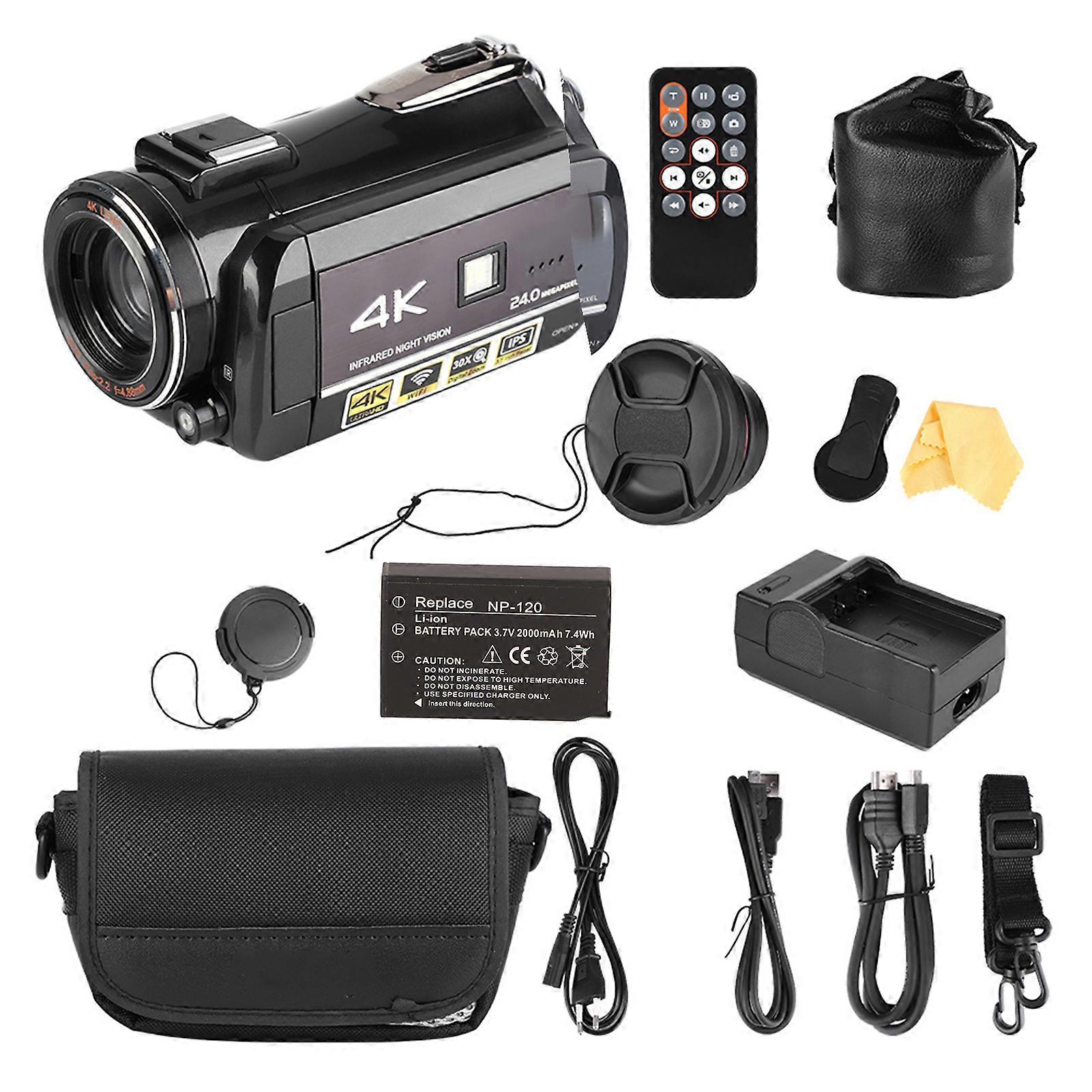 Package List1 x Digital Camcorder1 x Remote Controller1 x Remote Controller Battery (built-in)1 x HD Cable1 x USB Cable1 x Charger Power Cord1 x Charger1 x Lens Hood1 x NP-120 Battery (built-in)1 x Manual1 x Camcorder Store Bag1 x Store Bag Safty Rope1 x Large Wide Angle Lens (0.39 x)1 x Lens Mobile Phone Holder Clip1 x Lens Store Bag1 x Cleaning Cloth