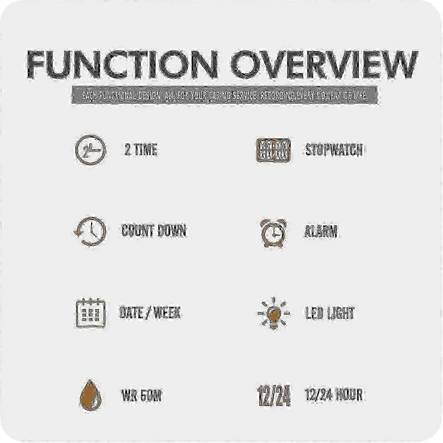 Simple style outlook, large dial design. LED backlight display, enable to show time clearly whenever day or night. Use import EL Lamp, press "LIGHT" button to see the time clearly in the night, easy to read. Multi-functions: Japanese movement keep accurate time, dateweek calendar, stopwatch, luminous display,alarm, 1224 hour formats, 5atm waterproof, scratch shock resistant. stylish digital watch for men women, especially to those who like doing sports, which make it perfect for both outdoor indoor sports or casual daily use. Designed with lightweight resin bezelcaseband, stainless steel back cover, which are friendly to the skin without any harms, extremely comfortable to wear. 164 ft waterproof (50 Meters) and durable meterials suit for everyday use. Splashrain resistant. No worry about water splashes, sweat, rain or washing hands. but please DO NOT press any buttons in the water and not for hot water or swimming.Simple style outlook, large dial design. LED backlight display, enable to show time clearly whenever day or night. Use import EL Lamp, press "LIGHT" button to see the time clearly in the night, easy to read.Multi-functions: Japanese movement keep accurate time, dateweek calendar, stopwatch, luminous display,alarm, 1224 hour formats, 5atm waterproof, scratch shock resistant.stylish digital watch for men women, especially to those who like doing sports, which make it perfect for both outdoor indoor sports or casual daily use.Designed with lightweight resin bezelcaseband, stainless steel back cover, which are friendly to the skin without any harms, extremely comfortable to wear.164 ft waterproof (50 Meters) and durable meterials suit for everyday use. Splashrain resistant. No worry about water splashes, sweat, rain or washing hands. but please DO NOT press any buttons in the water and not for hot water or swimming.