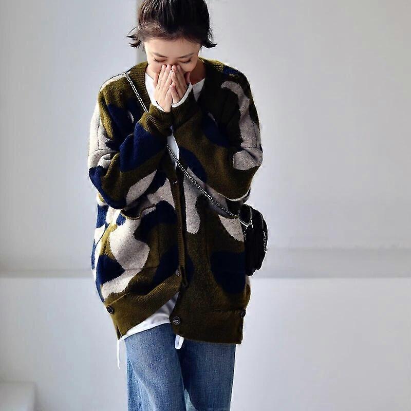 W3663C Literary leisure contracted individual character camo knits flower loose V - neck torn sweater cardigan woman