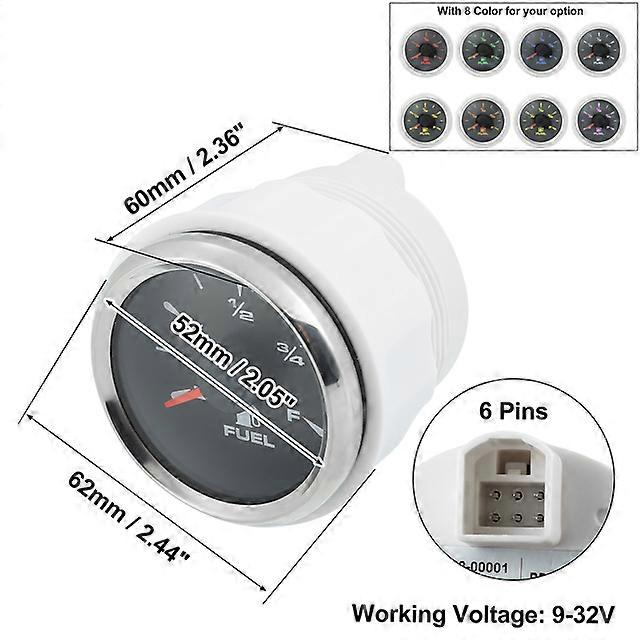 Description: Used to measure the fuel level of automobiles. This gauge is accurate and portable. Numbers and pointer clearly show. Showing the position of the oil tank level. Universally suitable for motorcycles, cars, trucks, marine boats. Easy to install, with installation instruction. All gauges are brand new. Specification: Product Name: Universal Fuel Level Gauge Indicator Application: For Motorcycle Car Truck Marine Boat Meter Signal: Adjustable Material: Stainless Steel, Plastic Frame Color: Silver Tone Background Color: Black Shell Color: Silver Tone, Black, White Backlight: 8 Colors Working Voltage: 9-32V Waterproof: Yes, IP67 Product Diameter: 52mm / 2.05 Number of Pins: 6 Dimension: 62x60mm / 2.44x2.36(H*Max.D) Note: Fit for most kinds of fuel level sensors. Please make sure this part fits your vehicle before ordering. Please allow 1-2mm error due to manual measurement. Package Included: 1 x Fuel Level Gauge 1 x Wire harness 1 x Installation Instruction