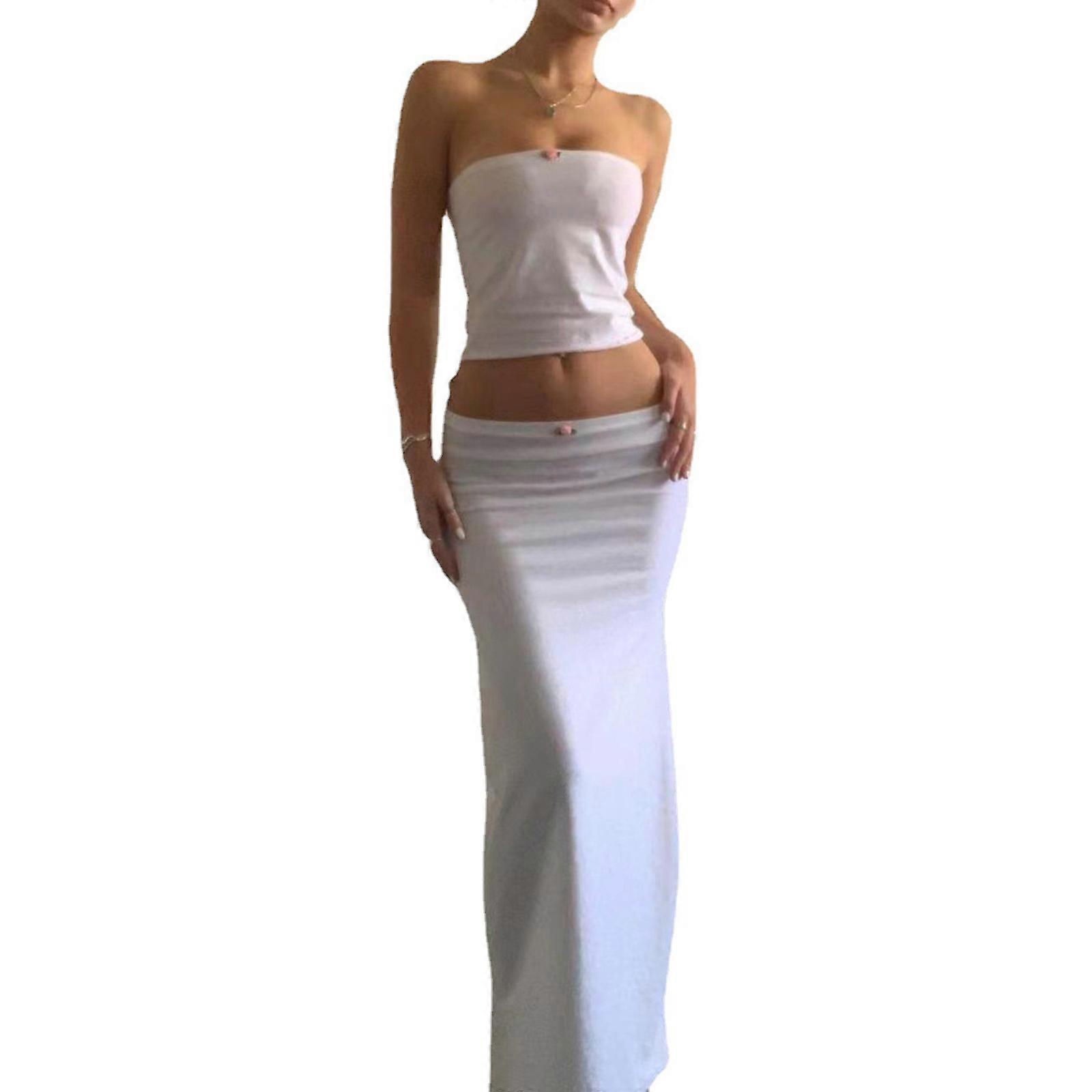 Y2K Bustier Sleeveless Dress 2 Pieces Flower Solid Suits Women Sexy Parties Clubs Clothing for Summer Music Festival Set White S